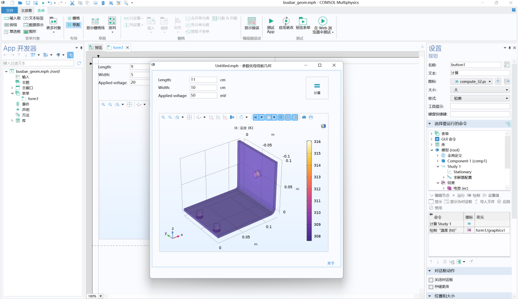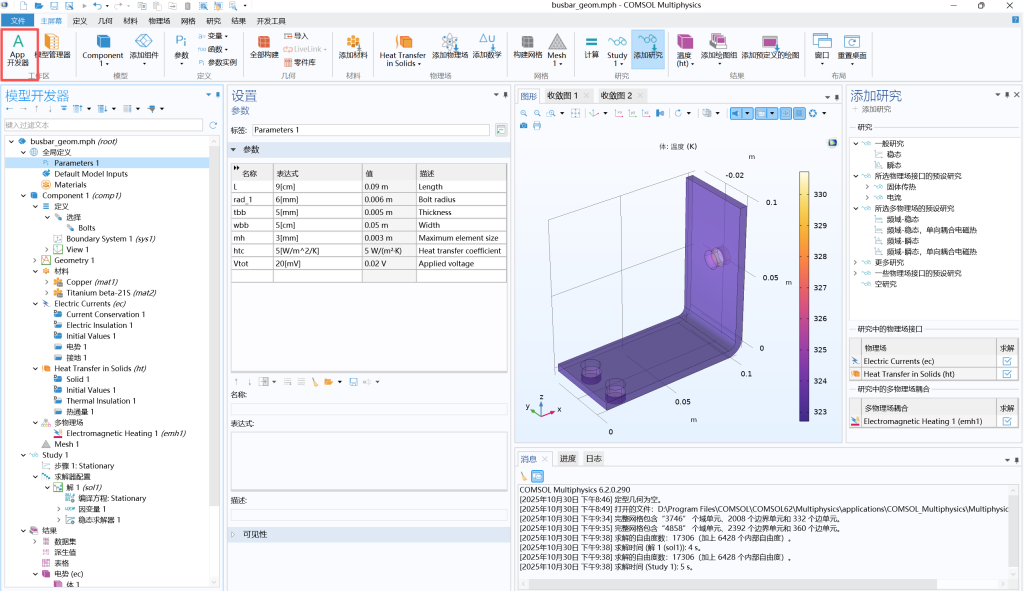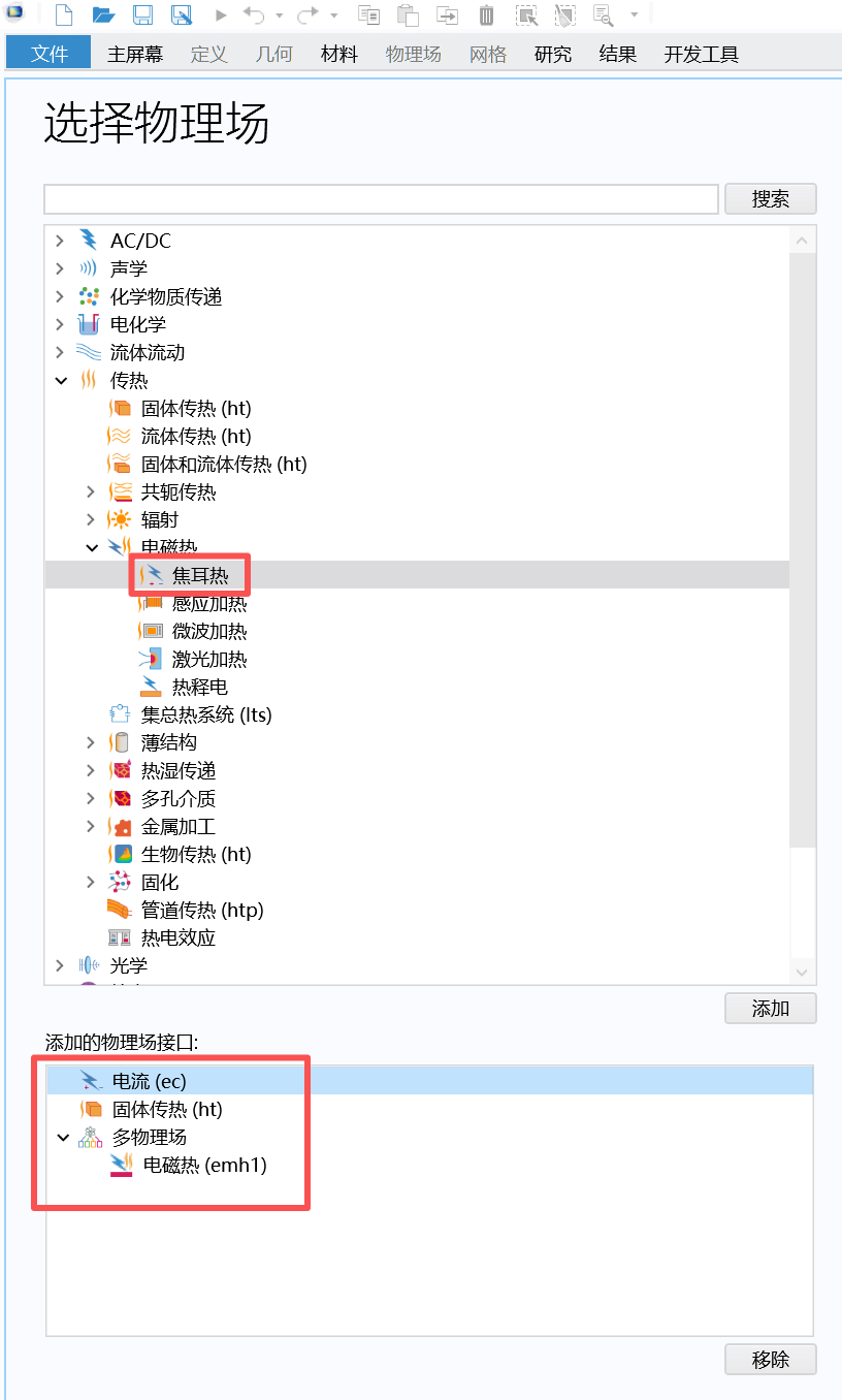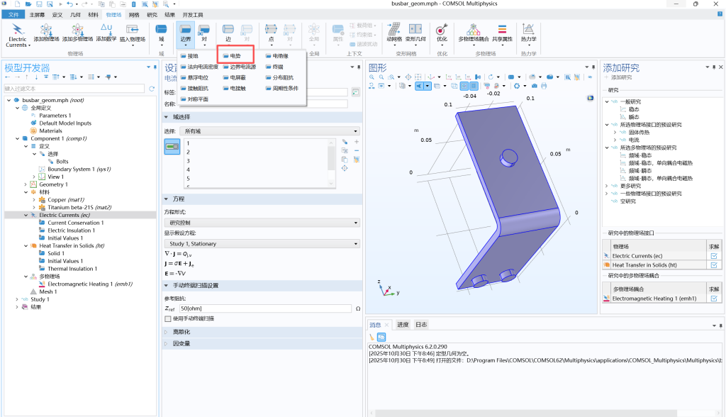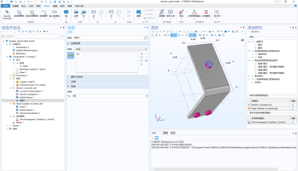 S7:开始建立物理场,选择电势(electric potential),选择面施加20mV电势
