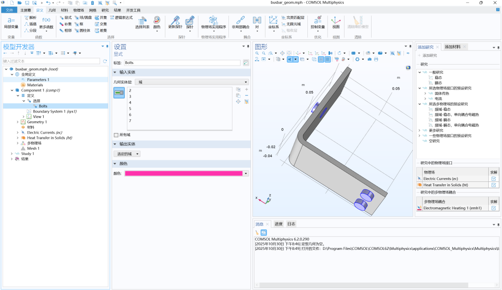 S6:设置材料属性,使用内置材料属性,先选择Copper将材料添加至零件,再选择Titanium beta-21S将材料添加至零件,然后将该材料的施加范围选择Bolts,完成替换